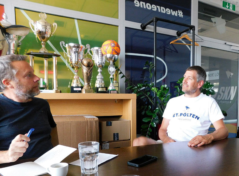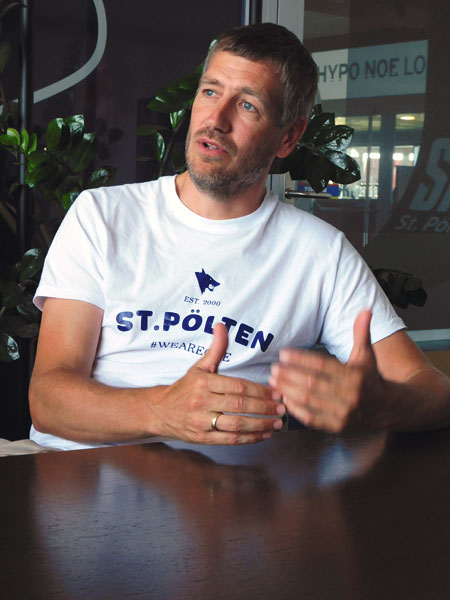 Im Prinzip hast du in vielen Bereichen die gleichen Themen wie sie etwa auch in einem kleinen Amateurverein wie Kilb bestehen, nur dass sie in der Bundesliga intensiver sind und die finanzielle Größenordnung eine andere ist. Aber hier wie dort brauchst du ein klares Bild der Situation, eine klare Vision, wo du hin willst und an der du auch festhältst. An den eingeschlagenen Weg zu glauben, auch wenn es Rückschläge gibt, hat mir beim SKN in den letzten Jahren oft gefehlt. Da wurde bisweilen mit Panik reagiert und alles auf einmal über den Haufen geworfen. Letztlich geht es aber um Nachhaltigkeit. In Kilb haben wir etwa vor einigen Jahren beschlossen, wir spielen ohne Legionäre – da haben auch viele gemeint, da werdet ihr aber keinen Erfolg haben, und es gab auch schwere Zeiten, wir sind uns aber treu geblieben und habens durchgezogen – mittlerweile spielen wir das 7. Jahr in der Landesliga! Zudem ist es aus meiner Sicht unerlässlich, dass wir hier in St. Pölten einen regionalen Weg gehen. Da ist enormes Potenzial vorhanden. Neben der großen Stärke des SKN – der Infrastruktur – bist du hier zugleich ja auch in der Landeshauptstadt, kannst also in gewisser Weise für dein ganzes Bundesland stehen. Die Nähe zu Wien ist dabei kein Nachteil, sondern ein großer Vorteil, wenn ich an Spieler denke oder auch potenzielle Sponsoren! Wir möchten jedenfalls eine unverwechselbare DNA schaffen, wo die Niederösterreicher sagen: ‚Das ist unser Klub!‘